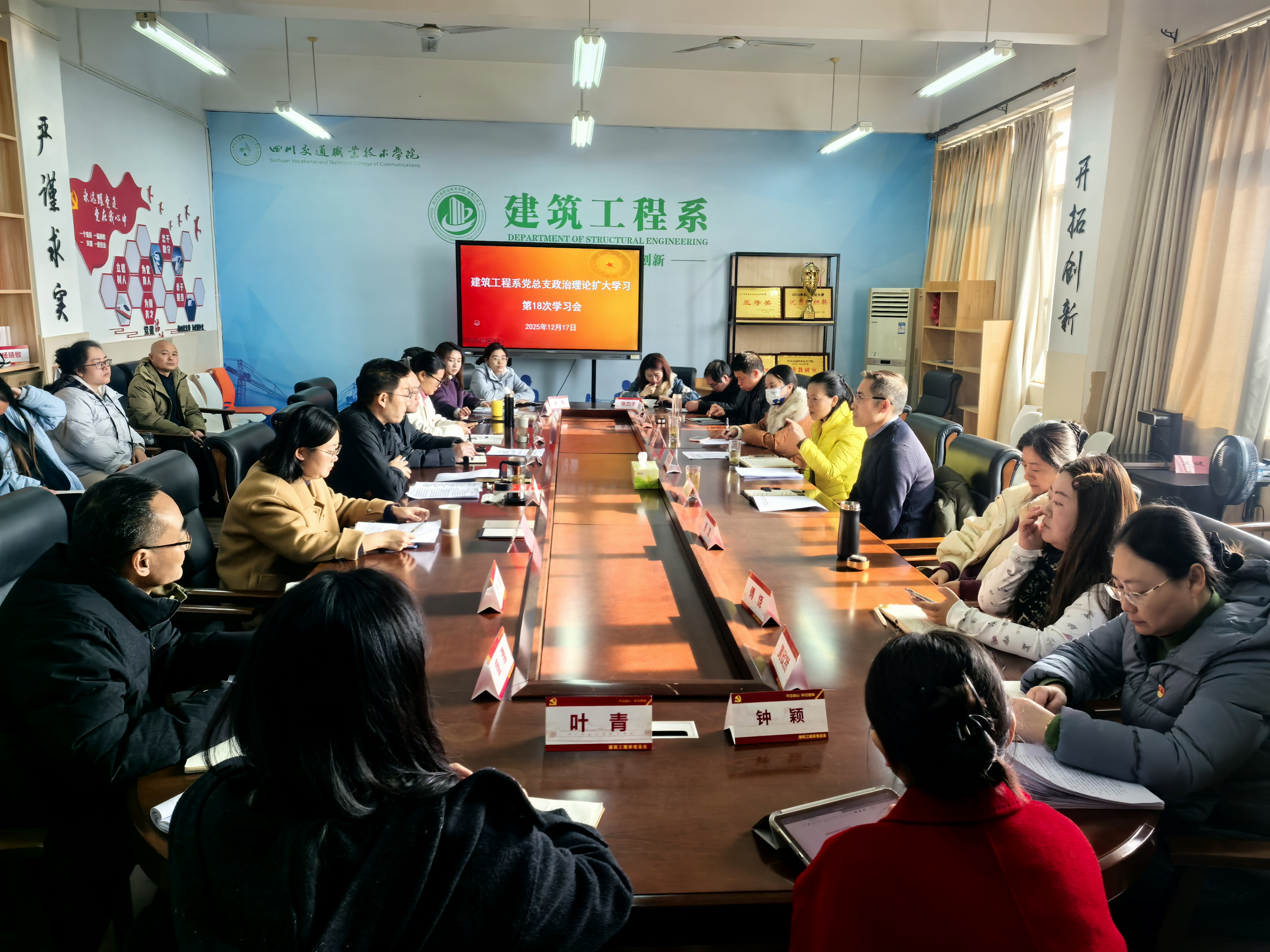2025年12月17日上午,四川交通职业技术学院建筑工程系第18次党总支政治理论学习(扩大)会议在笃行楼610会议室召开。系党总支书记周凯同志主持,学院副院长刘玉荣同志以党员身份参加并指导,学院党委教师工作部部长黄蜀云,党委宣传统战部相关人员出席会议。系班子成员、全体党员同志参会。